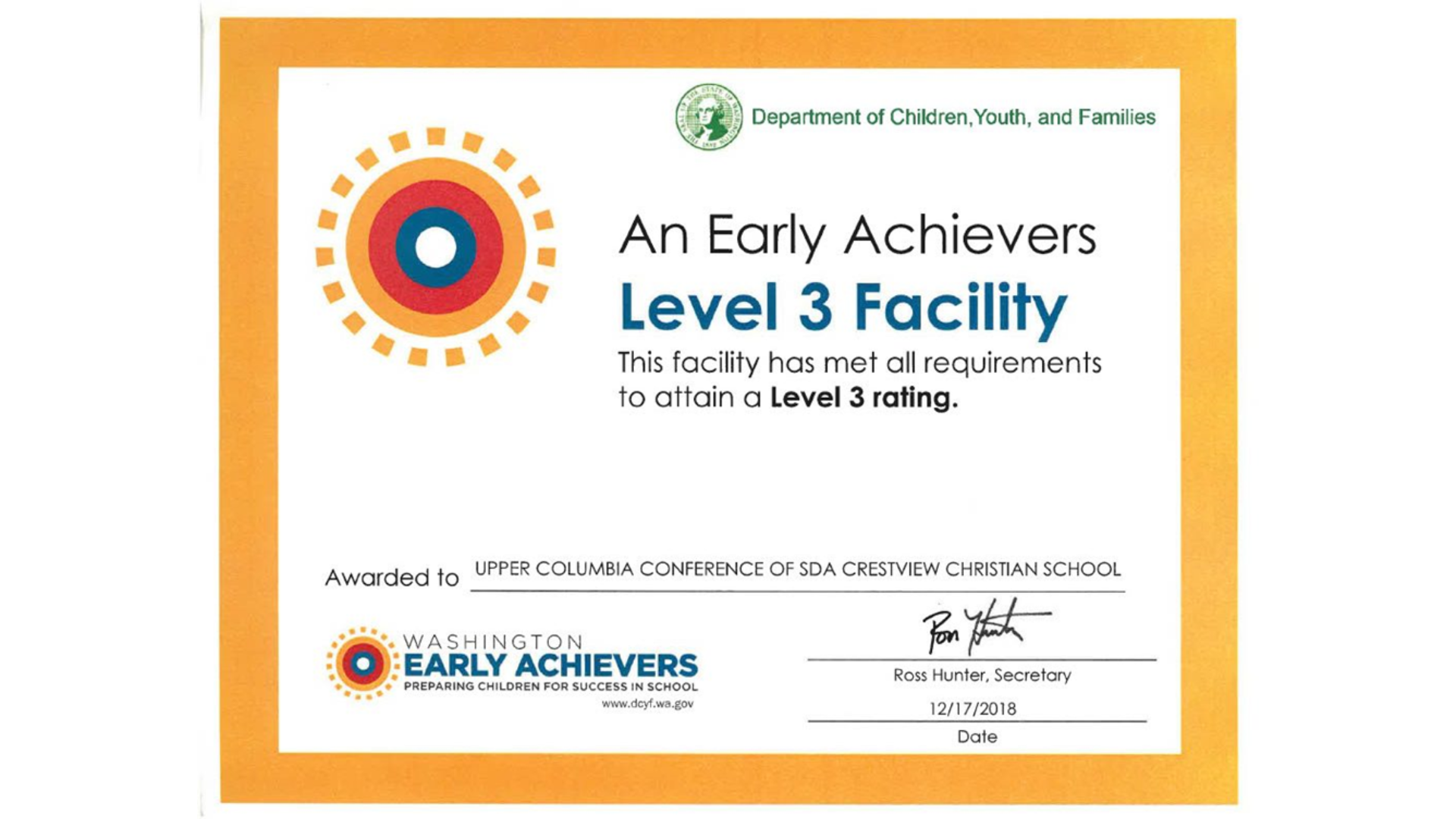 Certificate awarded to Upper Columbia Conference of SDA Crestview Christian School for meeting all requirements for a Level 3 rating, issued by the Department of Children, Youth, and Families, signed by Ross Hunter on 12/17/2018.